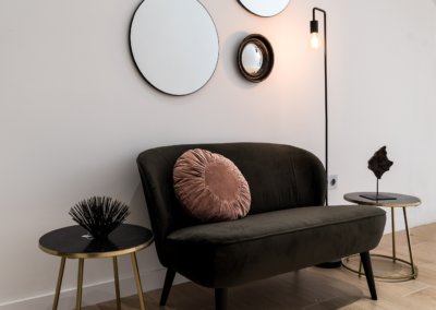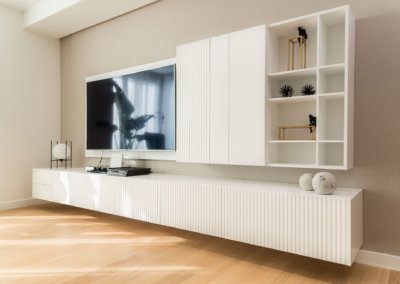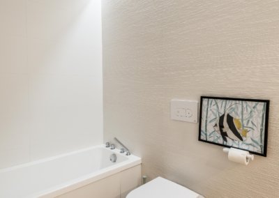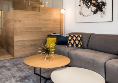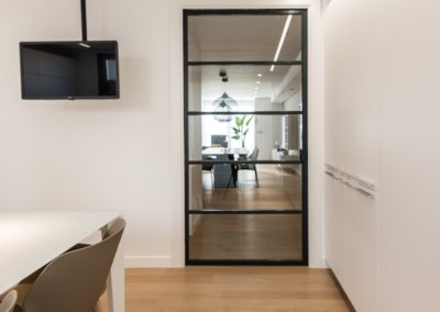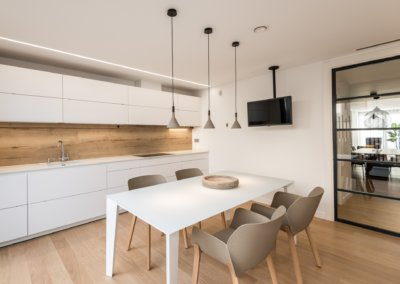 En este proyecto es muy bonita la combinación de materiales un suelo de parque natural de roble de Listone Giordano que se podía utilizar en baños y en cocina en un tono clarito, que hace los espacios muy acogedores y tonos claros.