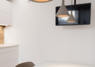 Una cocina que no pareciera una cocina, ya que tiene todo lo necesario oculto, y tambien una zona de desayunos con la cafetera, tazas y demás muy práctica y bonita.